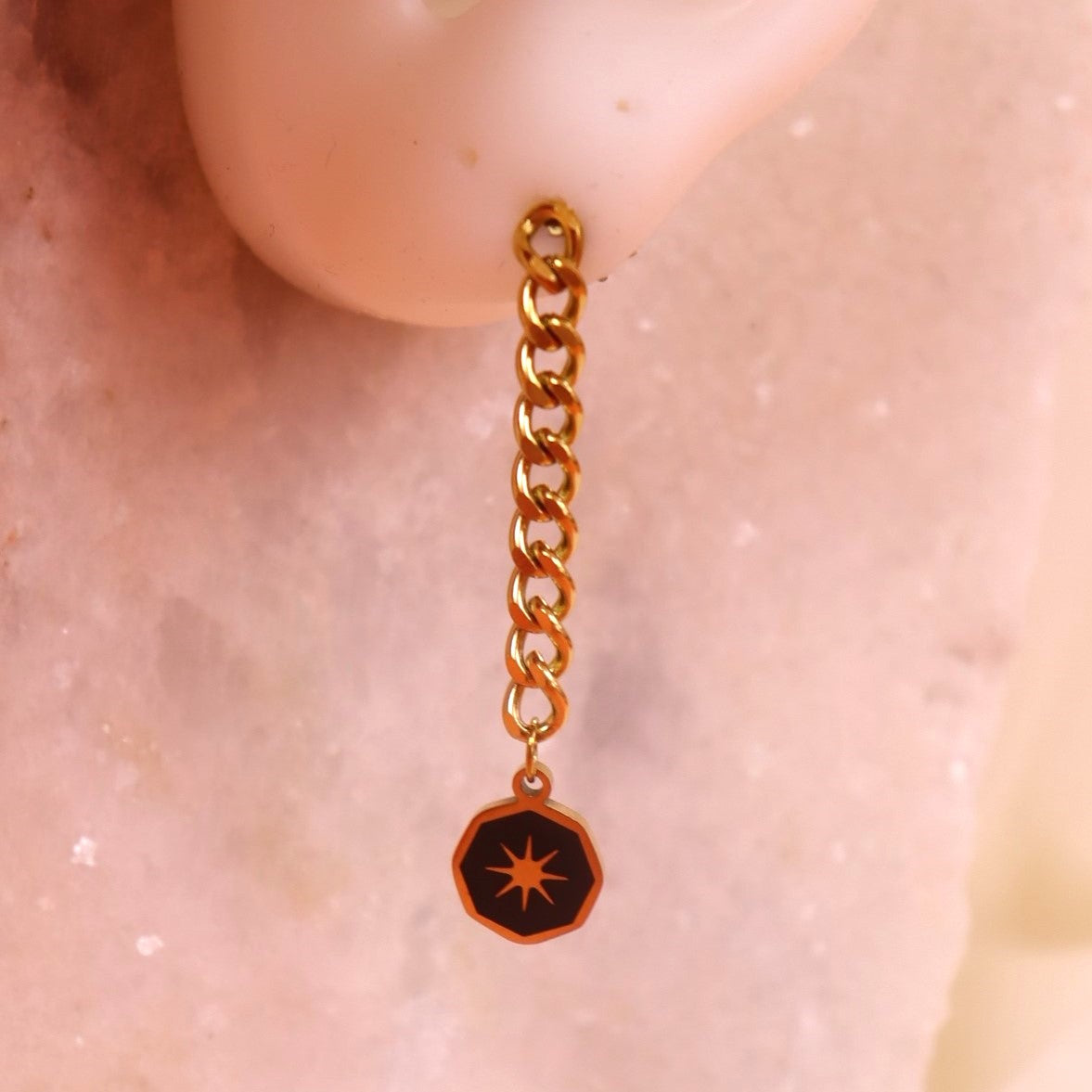 Find your sense of direction with our Compass Chain Earrings! The black charm on a thick chain adds a touch of edginess to any outfit. Mix and match for a unique look.