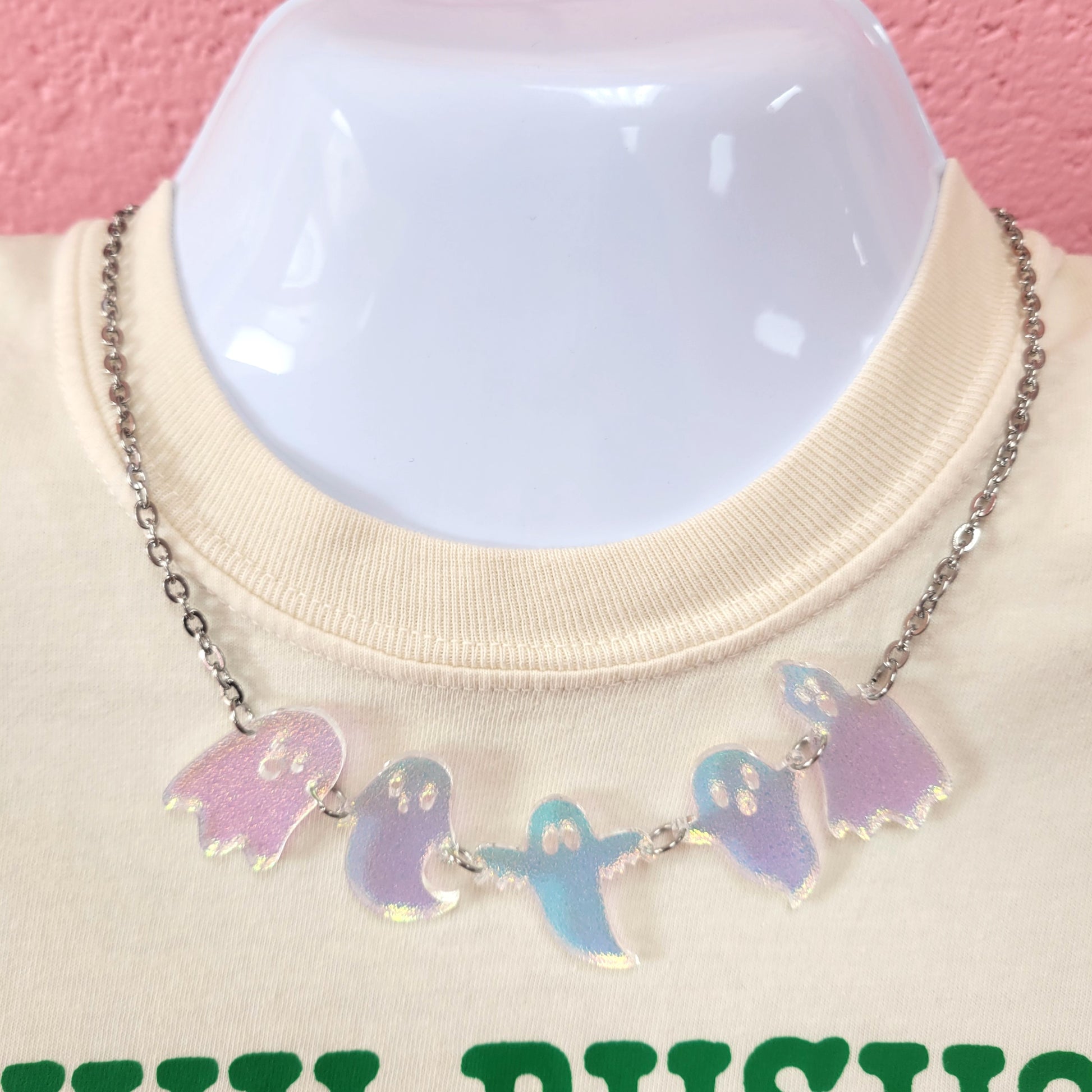 This playful statement necklace showcases five hauntingly cute iridescent ghosts joined together, creating a shimmering celebration of Halloween spirit. Their glowing charm adds a spooky yet fun flair to any outfit, making it the perfect accessory to brighten your autumn days with a dash of ghostly delight.