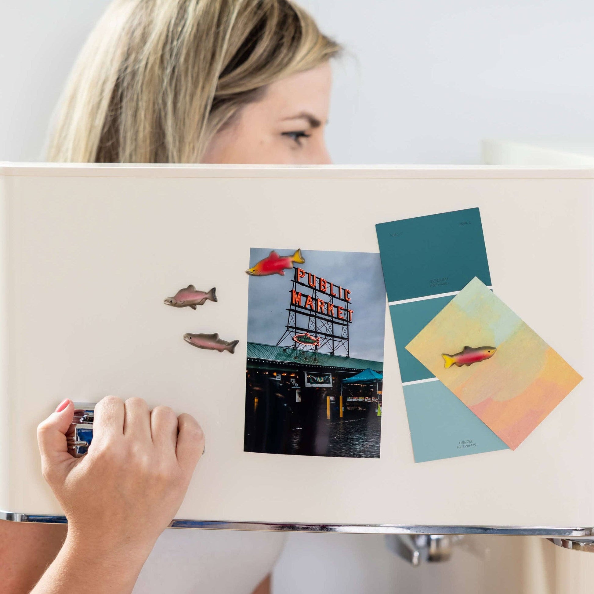 DETAILS Something fishy going on here... These hand-painted salmon magnets will spawn delight in your kitchen. Backed with strong mighties® magnets, they'll stick around!