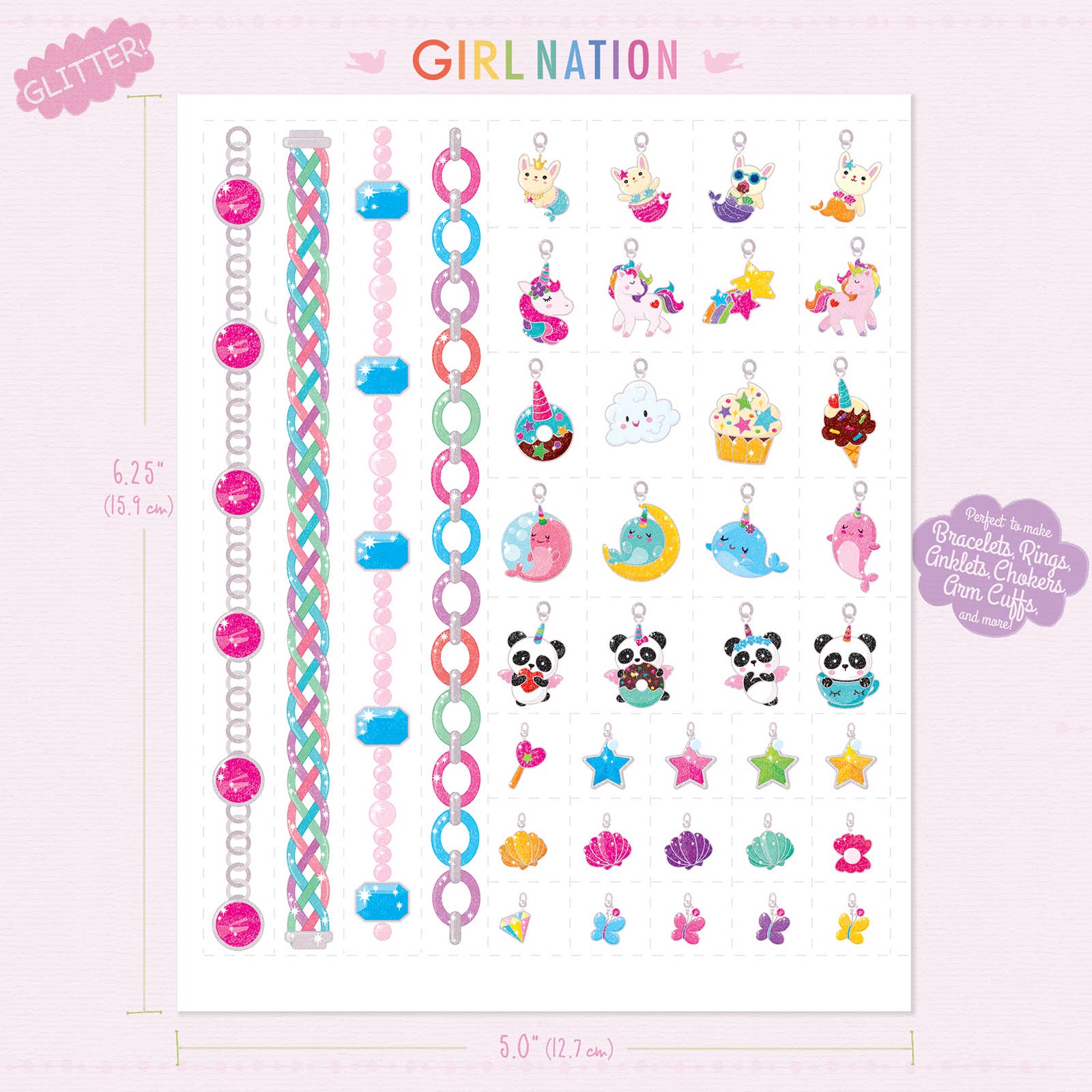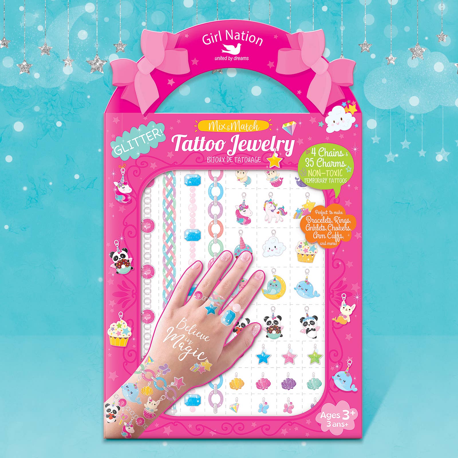 Mix and match Temporary Tattoos! Easy to apply and fun to wear! Mix & Match Girl Nation "Tattoo Jewelry" to create your own unique designs. Perfect for Birthday Gifts for Kids, Party Favors, Easter Baskets, Stocking Stuffers and more! Fashionable and fun, each pack includes 4 chains and 35 charms to create your own glittery Bracelets, Anklets, Chokers, Arm Cuffs Rings and more! Use a wet paper towel for easy application. Remove with baby oil or rubbing alcohol. Intended for ages 3-7. Not intended for children under 3.
