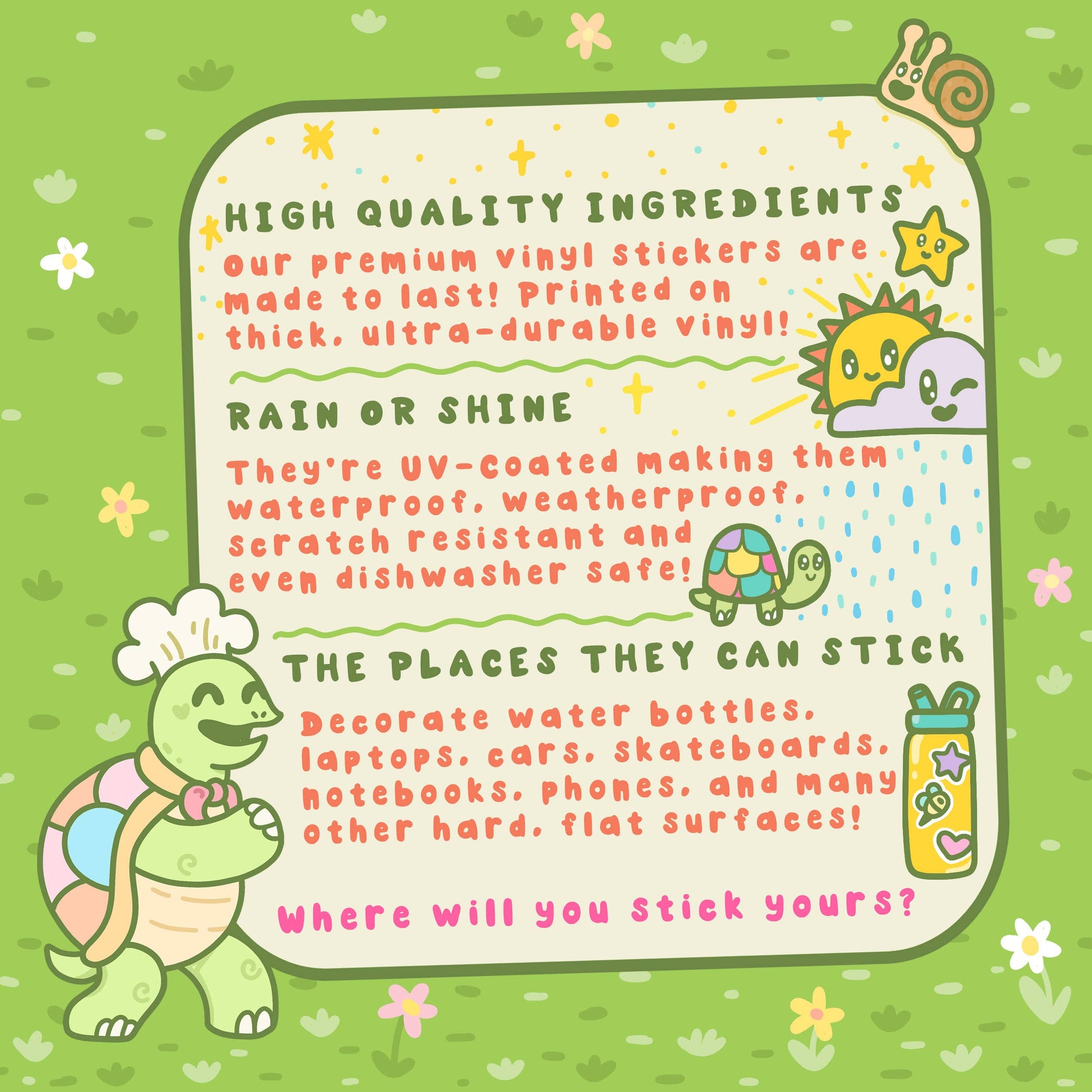 🐢 Our Turtley Awesome vinyl stickers are made from the highest quality ingredients on the market! Printed on thick, ultra-durable vinyl, these stickers are made to last. They're UV-coated making them waterproof, weatherproof, and dishwasher safe!